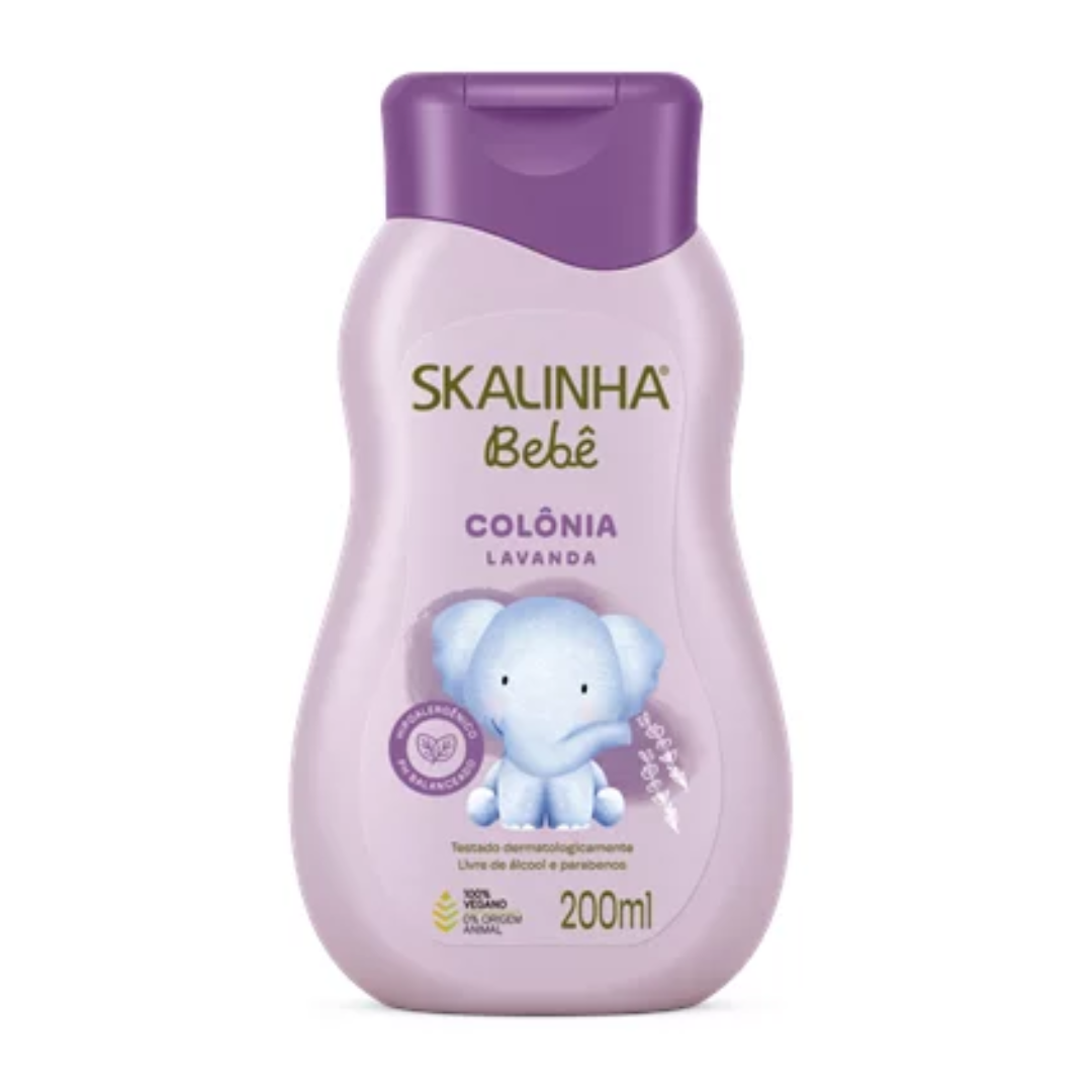 A Colônia Lavanda Skalinha Bebê é livre de álcool e parabenos. Com fórmula hipoalergênica e ingredientes naturais, não irrita a pele e perfuma de maneira suave proporcionando uma sensação gostosa de limpeza e frescor, sendo segura para uso de bebês de todas as idades.