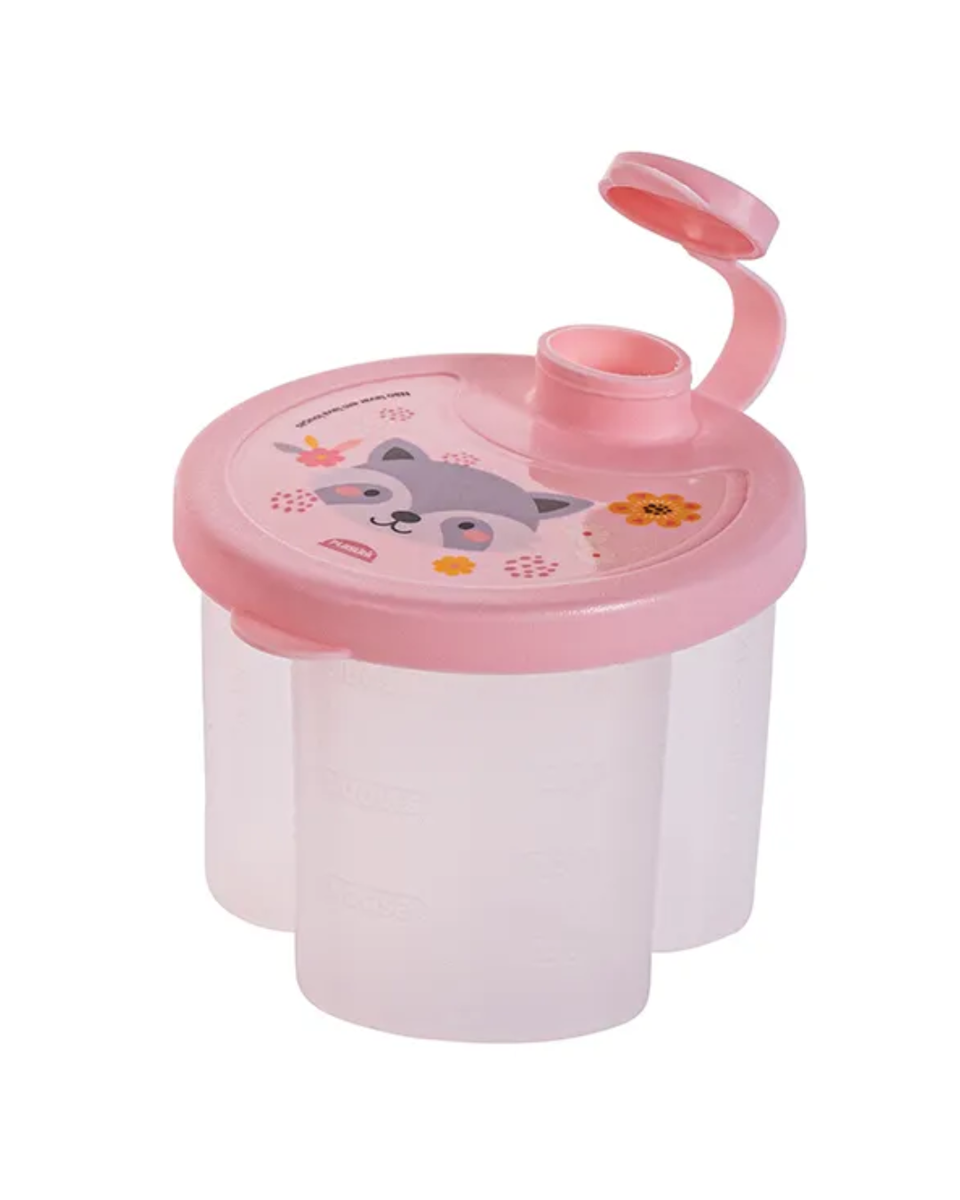 O dosador de leite em pó é dividido em três partes para facilitar a separação das quantidades, além de ter uma embalagem fofinha.
