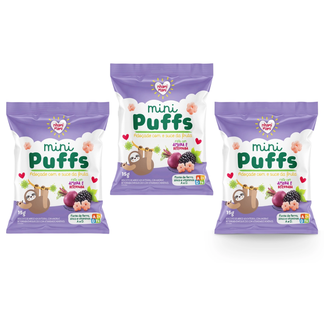 Neste Kit irá receber: 3 unidades do Mini Puffs Amora e Beterraba - Nhami Mami