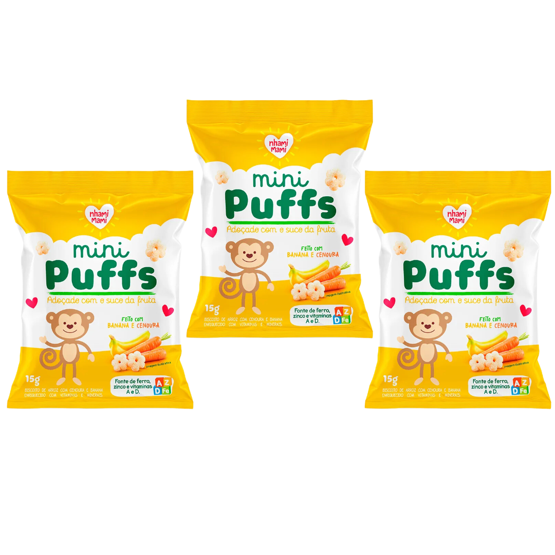 Neste Kit irá receber: 3 unidades do Mini Puffs Banana e Cenoura - Nhami Mami