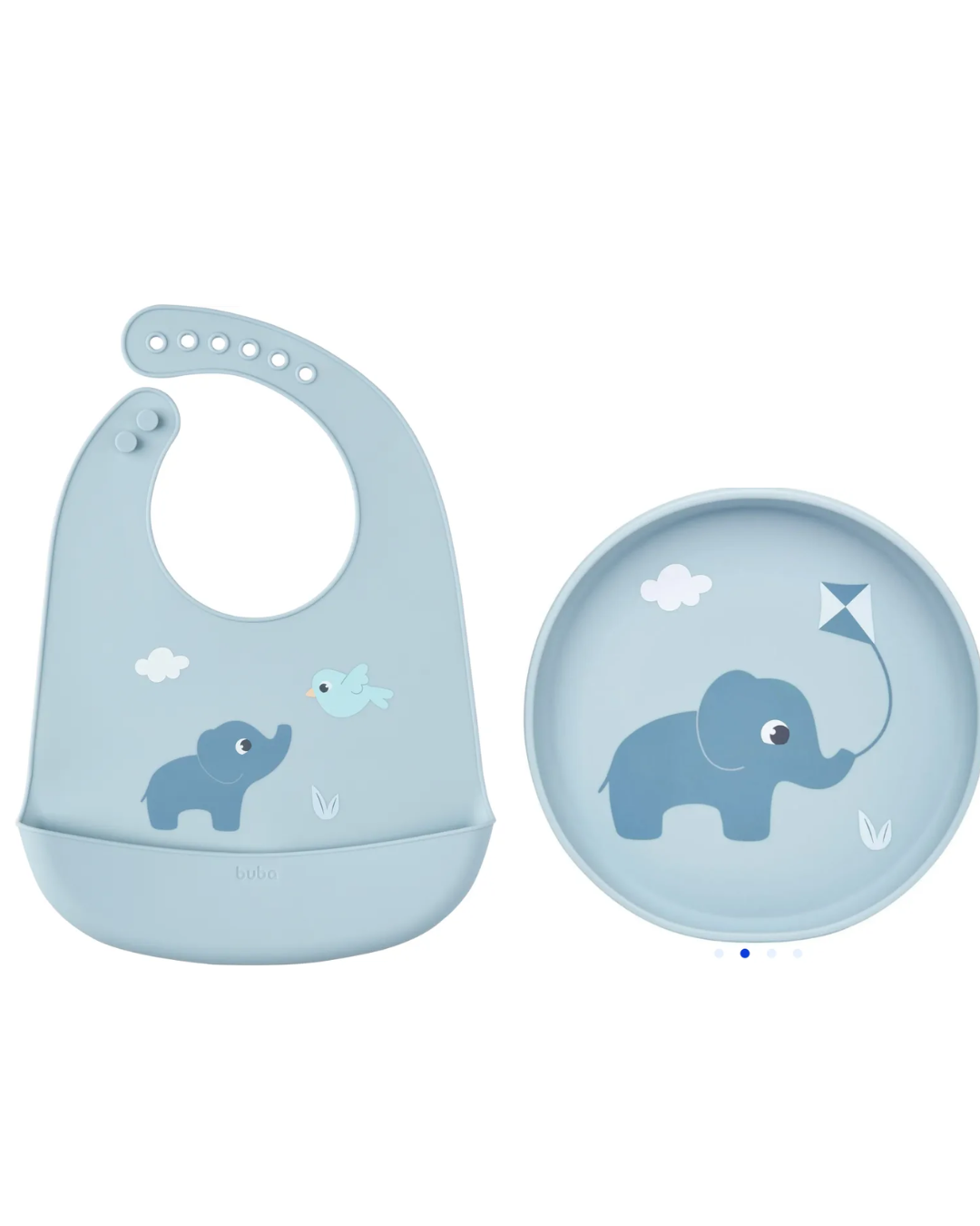 O Kit Buba Cloudy Elefante vem com um pratinho e um babador, ambos em silicone, super prático e higiênico. Possui bolso pega migalhas, ideal para proteger a roupinha do bebê. O fecho com botões se ajusta facilmente ao pescoço do pequeno.