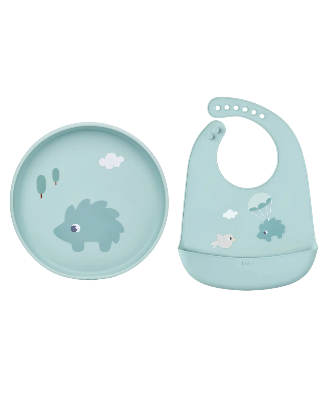 O Kit Buba Cloudy vem com um pratinho e um babador, ambos em silicone, super prático e higiênico. Possui bolso pega migalhas, ideal para proteger a roupinha do bebê. O fecho com botões se ajusta facilmente ao pescoço do pequeno.