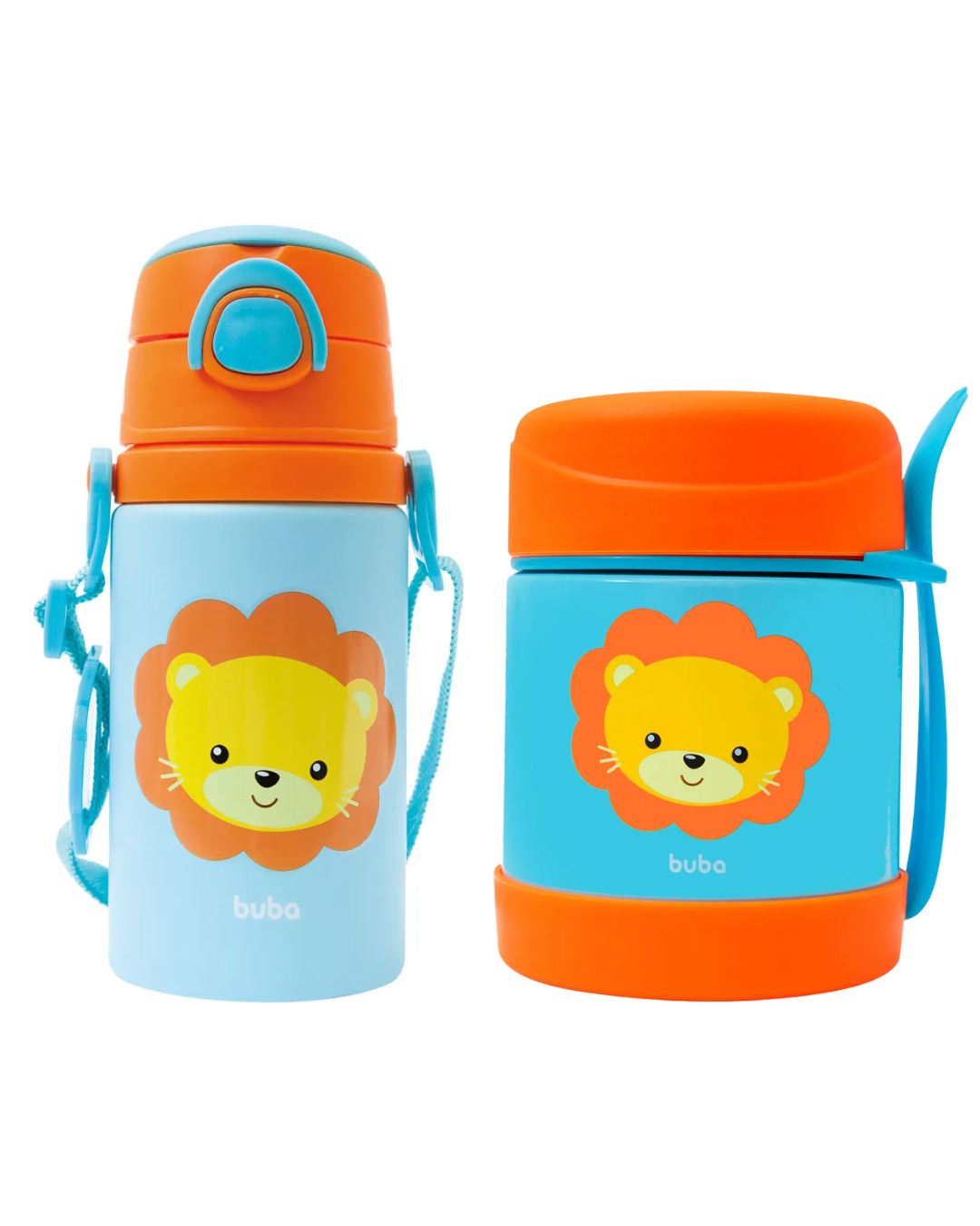 O Kit Leão da Buba com garrafinha e pote térmico é perfeito para viagens, passeios e eventos.